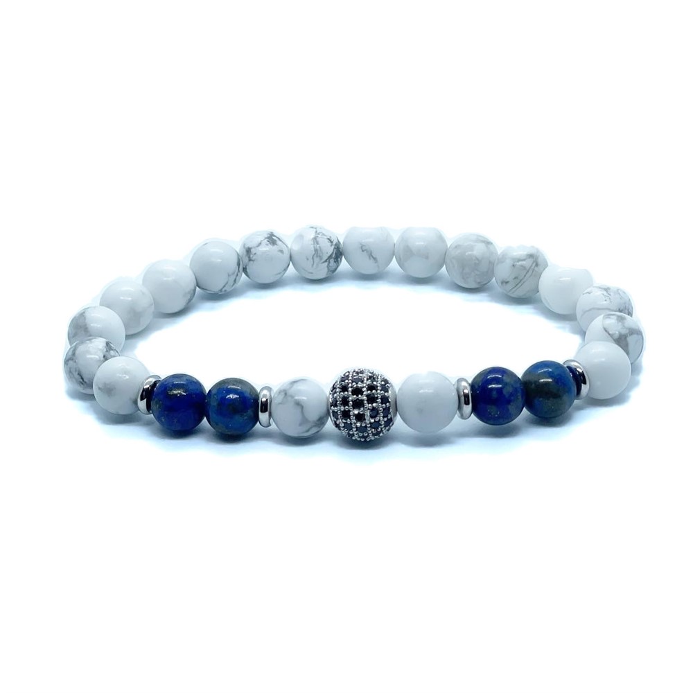 Ezüst cirkon gömb fehér márványos howlit és kék lapis lazuli férfi ásvány gyöngy karkötő.